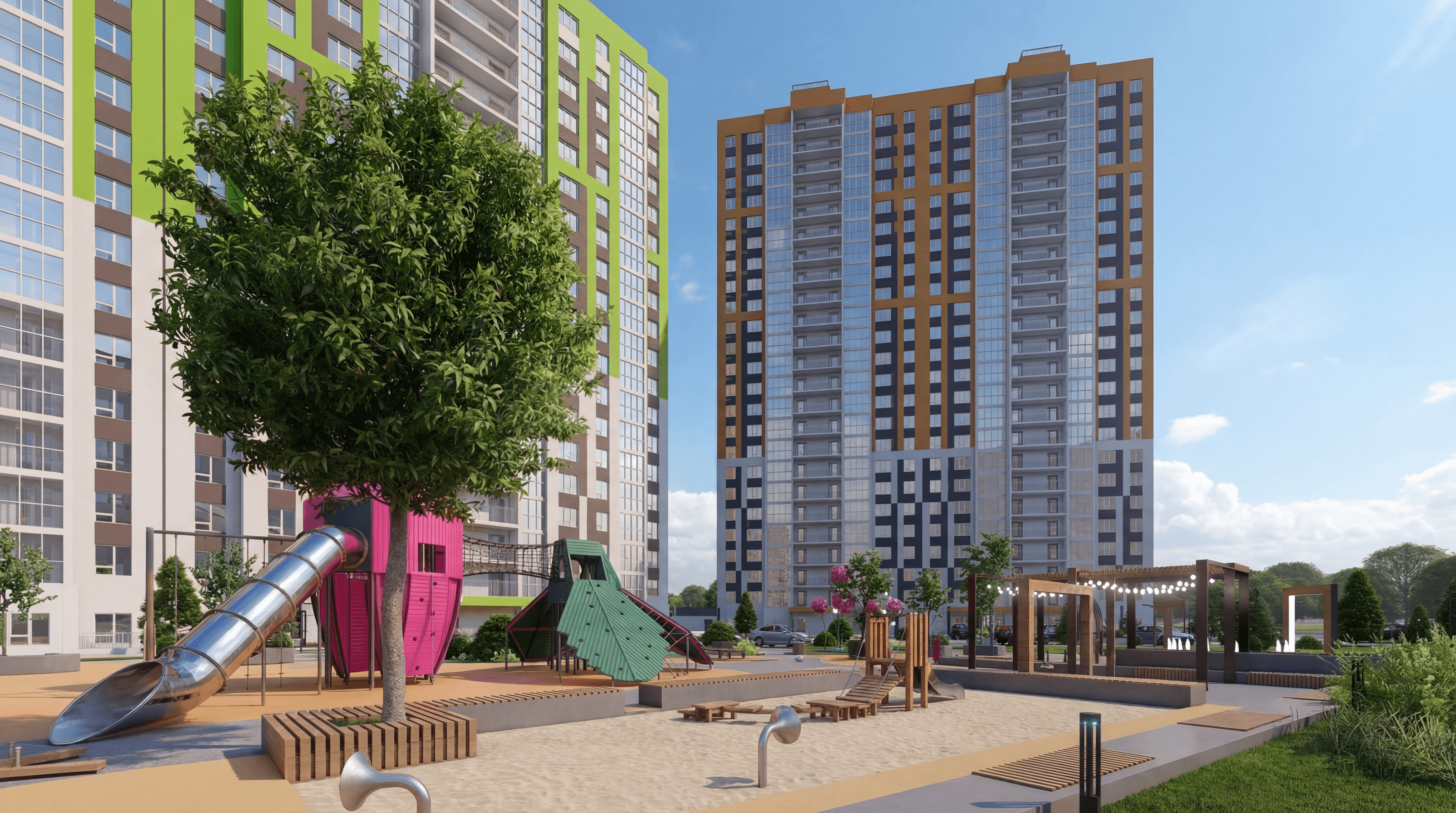 Для разработки плана благоустройства квартала мы задумались о повседневной жизни района. Как проводят время во дворе дети и что при этом делают взрослые. Пока малыши играют на площадке, родители общаются друг с другом. Мы предусмотрели инфраструктуру для тихого и активного отдыха и разделили эти зоны между собой.